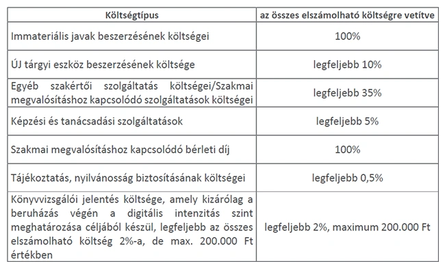 - Könyvvizsgálói jelentés költsége: kizárólag a beruházás végén a digitális intenzitás szint meghatározása céljából készül, legfeljebb az összes elszámolható költség 2%-a, de max. 200 000 Ft értékben.