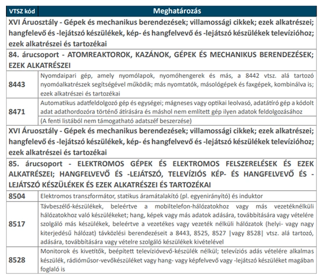 - Új tárgyi eszköz beszerzése legfeljebb az összes elszámolható költség 10 %-a lehet: szakmai megvalósításhoz kapcsolódó új informatikai, telekommunikációs, szenzortechnológiai, automatizációs és robotikai tárgyi eszközök költségei (hardver és egyéb ipari digitális eszközök, hálózati eszközök, telekommunikációs eszközök) bekerülési értéke a Felhívás 1. melléklete szerinti VTSZ lista alapján