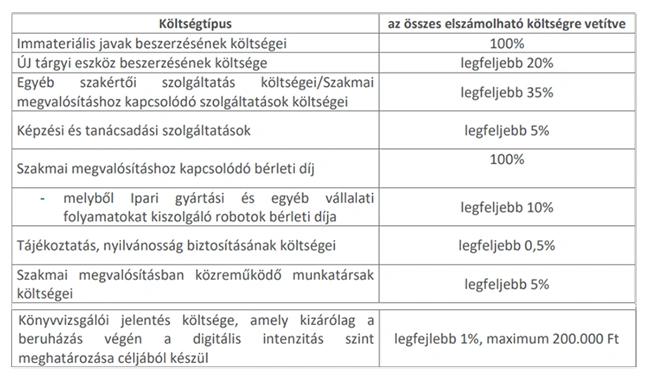 - Könyvvizsgálói jelentés költsége: kizárólag a beruházás végén a digitális intenzitás szint meghatározása céljából készül, legfeljebb az összes elszámolható költség 1%-a, legfeljebb max. 200 000 Ft értékben.