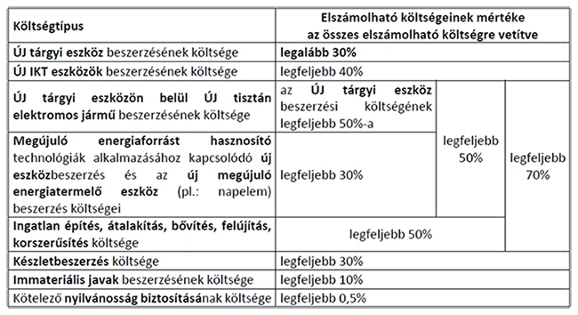 - Új tárgyi eszköz beszerzése legalább az összes elszámolható költség 30%-a értékben: technológiai korszerűsítést eredményező új, egyenként minimum nettó 200 000 Ft értékű eszközök (200 000 Ft érték alatti eszköz csak akkor támogatható, ha az a beszerzendő eszköz tartozéka, mely az árajánlatban, adásvételi szerződésben szerepel) bekerülési értéke, amely a vételáron felül tartalmazhatja az eszközbeszerzéshez kapcsolódó szállítás és üzembe helyezés, valamint az eszközbeszerzéshez közvetlenül kapcsolódó betanítás költségét is,