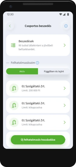 A funkciót az internetbankban a Számlabefizetés/ Csoportos beszedésmenüpontban, a mobilbankban a Továbbiak/Számlabefizetések, rezsi/ Csoportos beszedésmenüpontban találod.